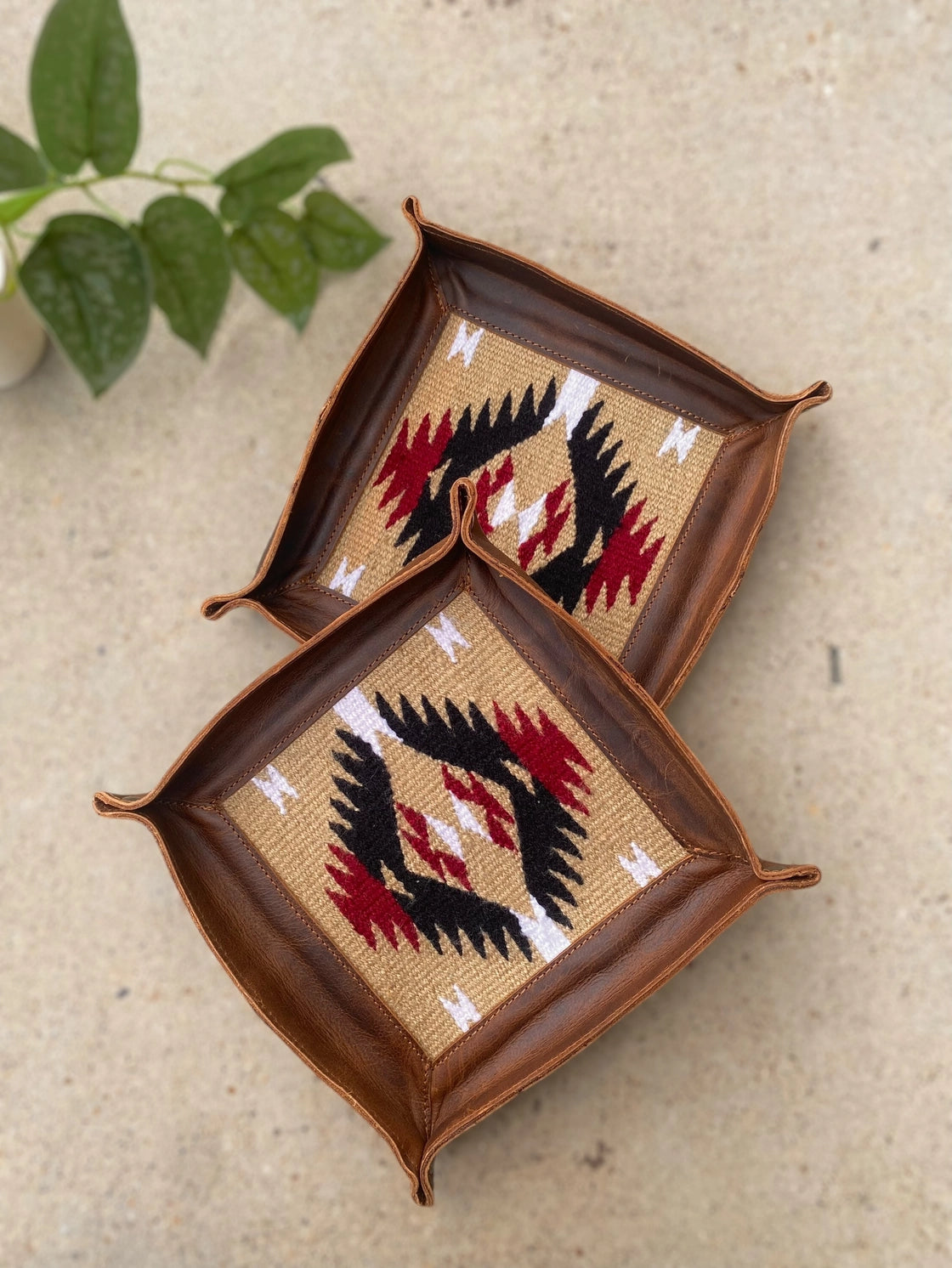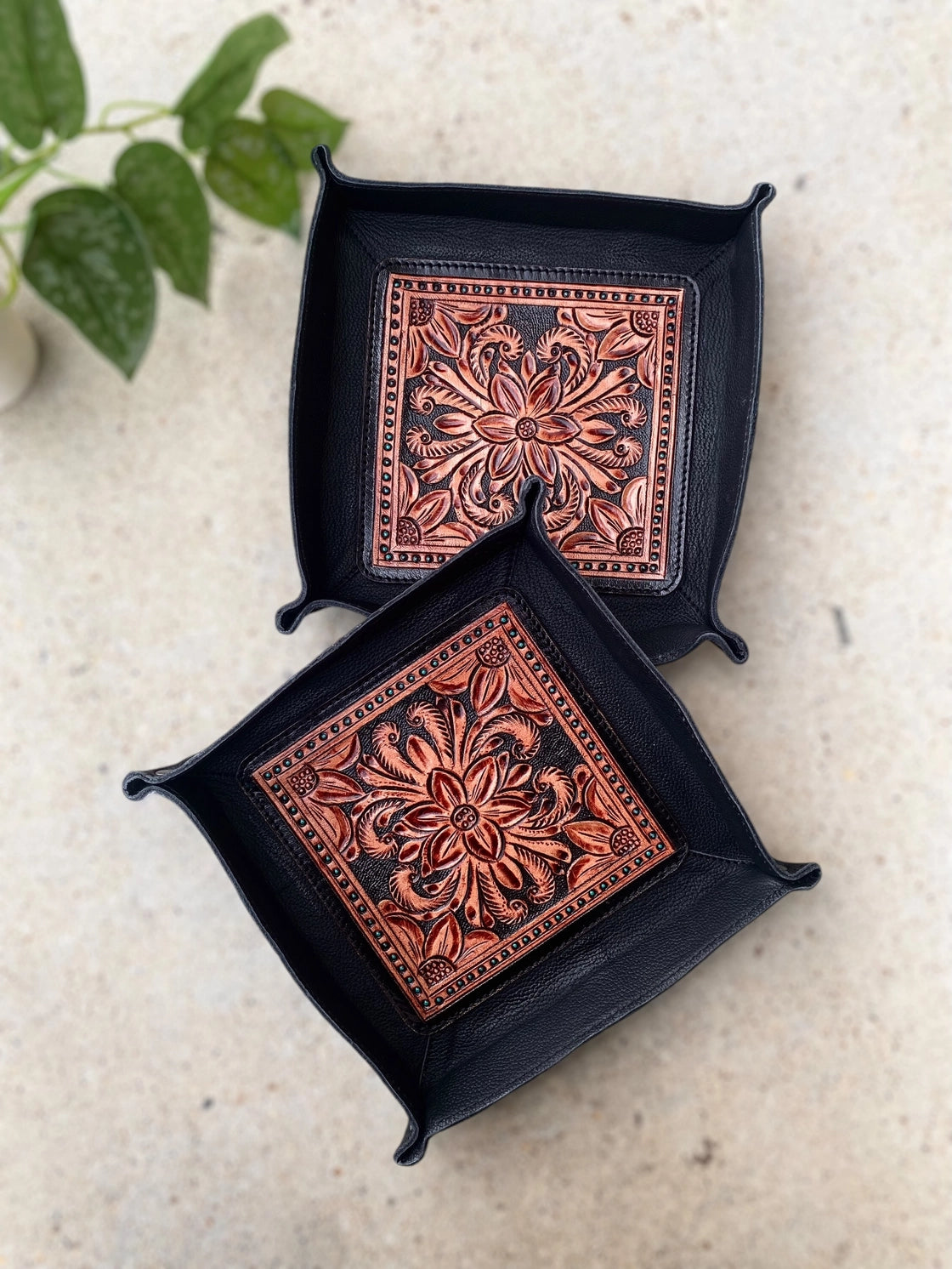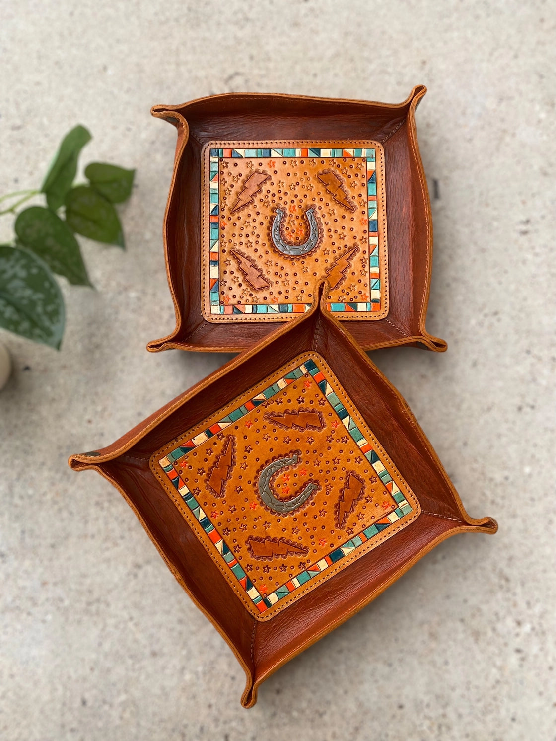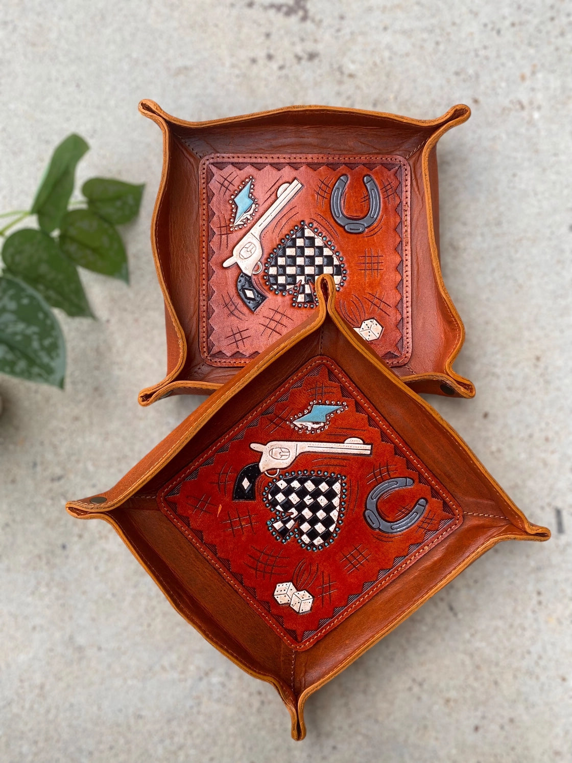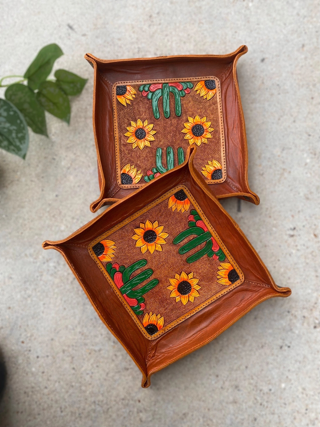 Small Decorative tray made of genuine leather and hand painted Measurement: 7x6”