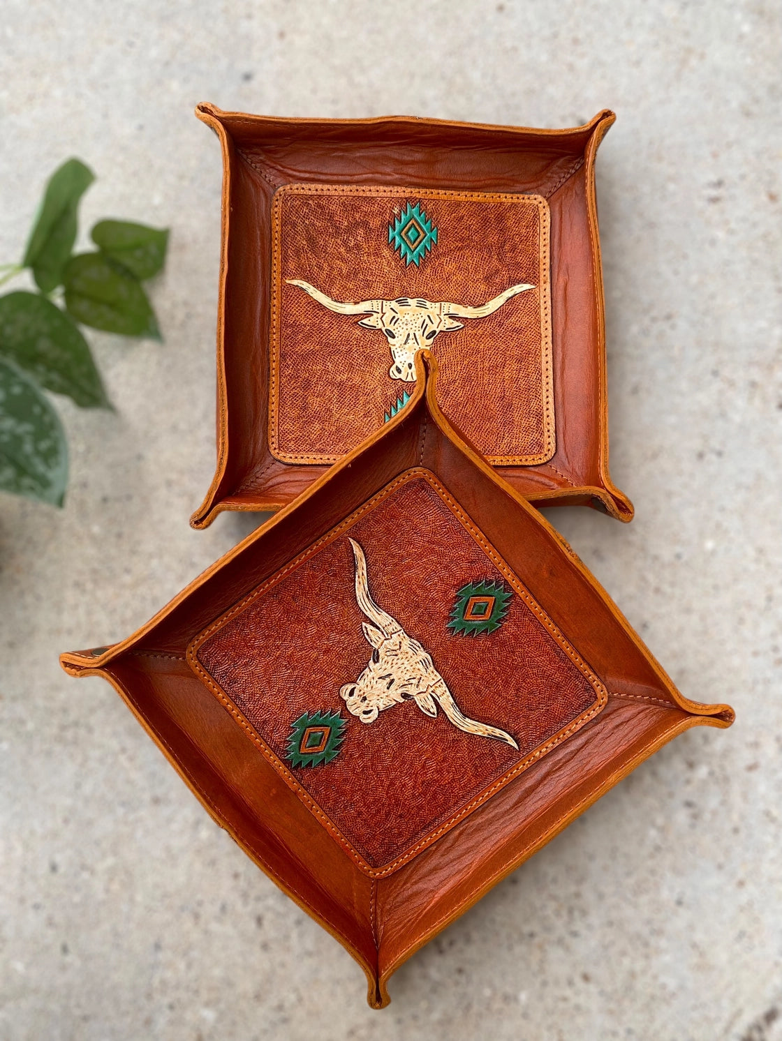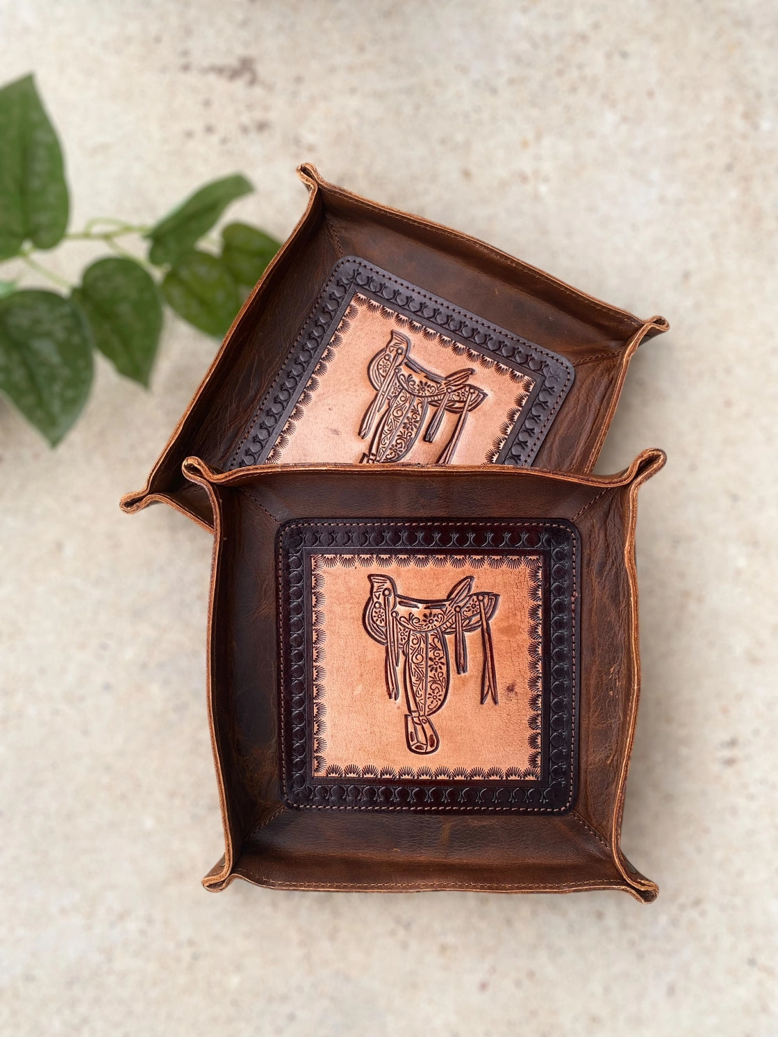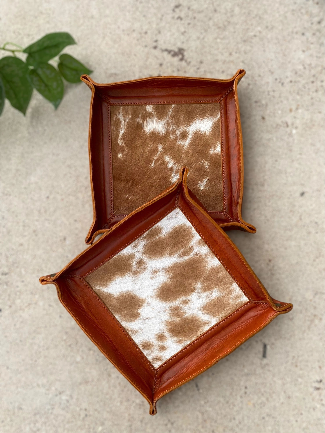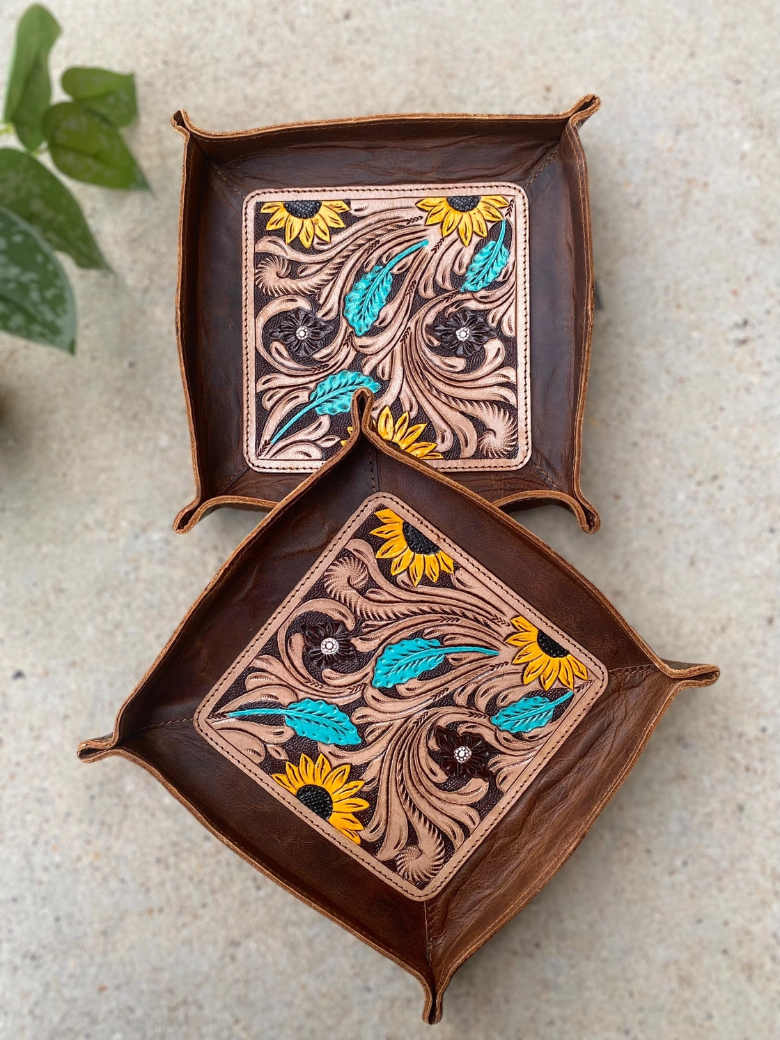 Small Decorative tray made of genuine leather and hand painted Measurement: 7x6”