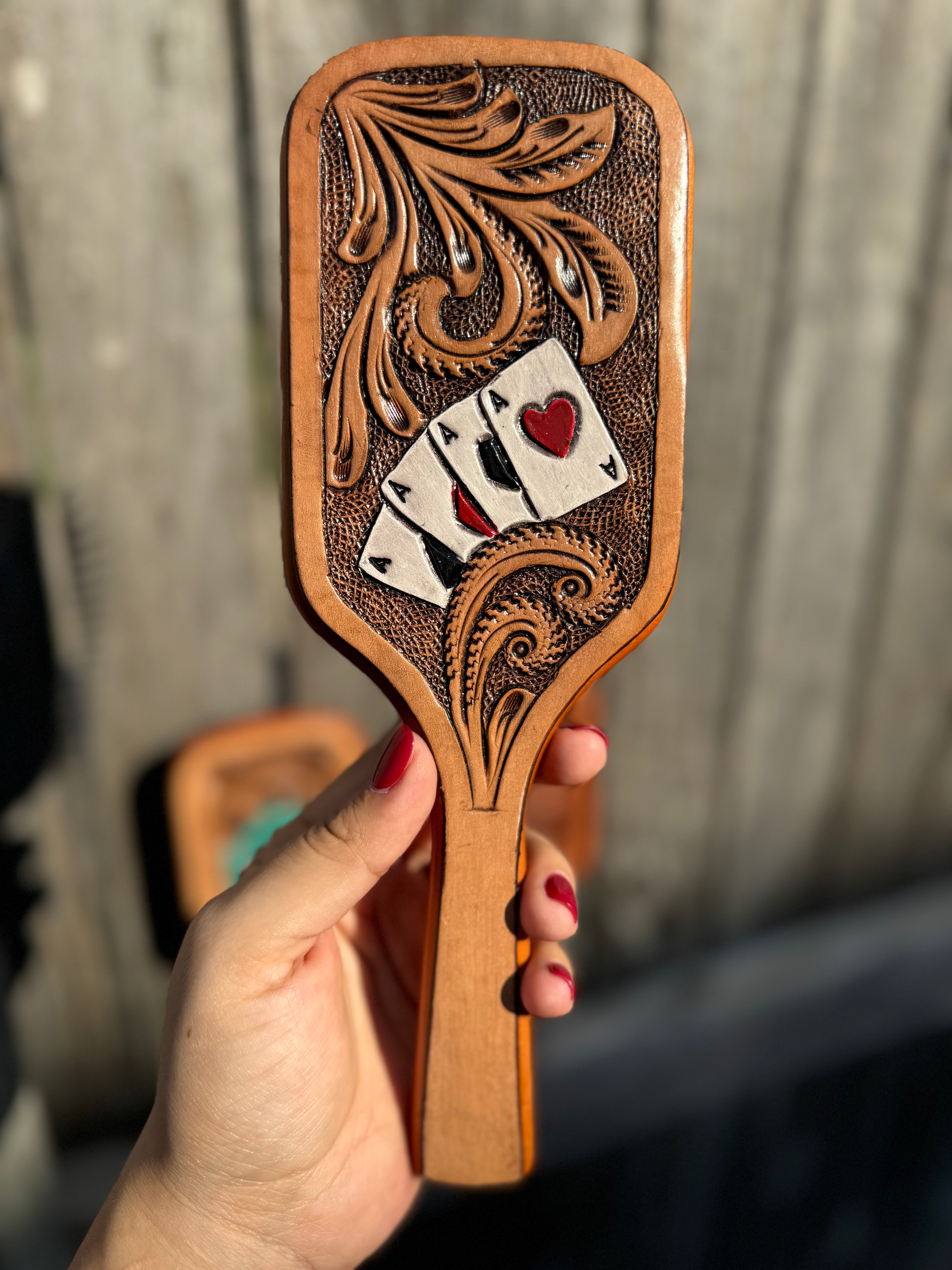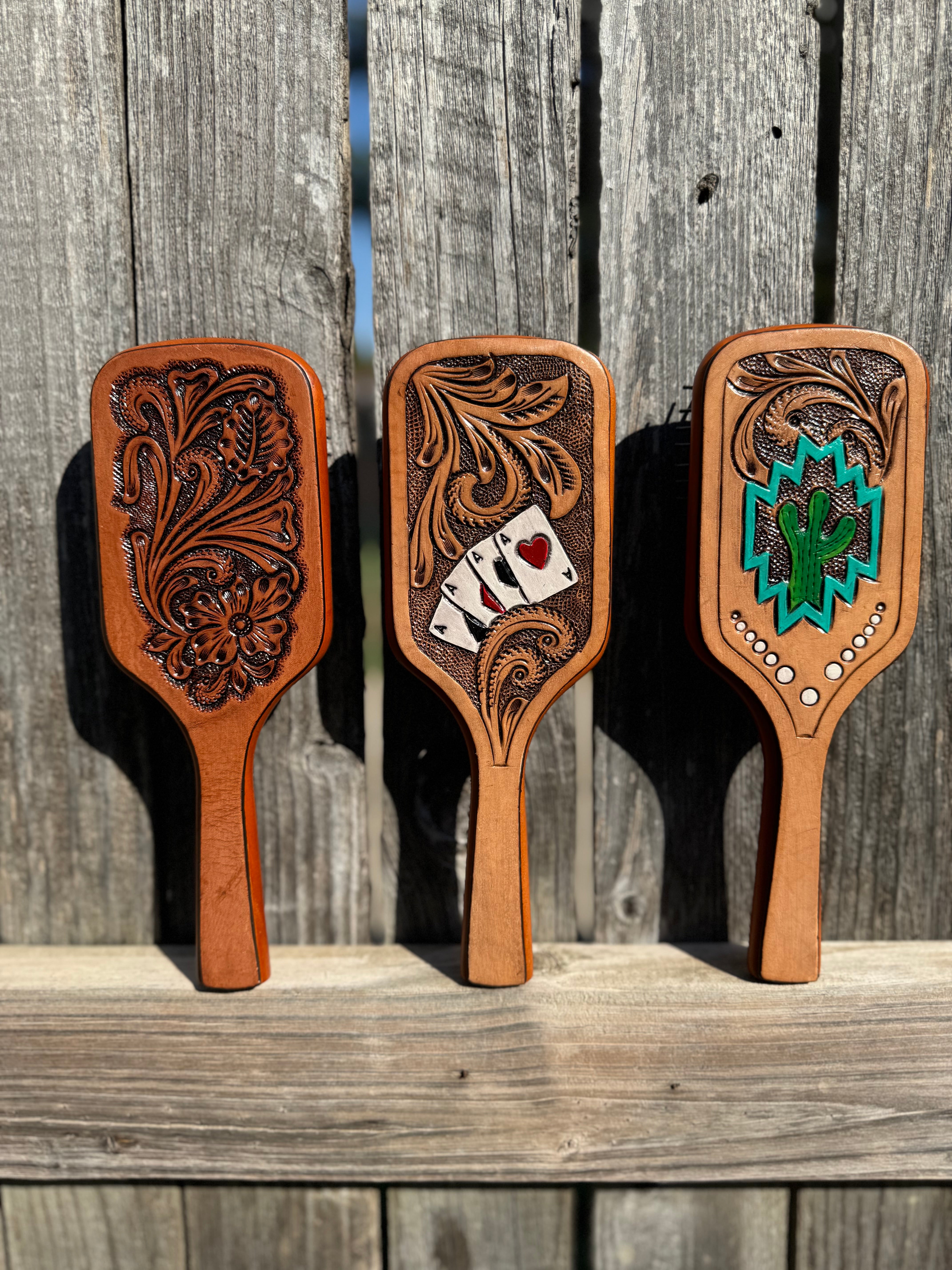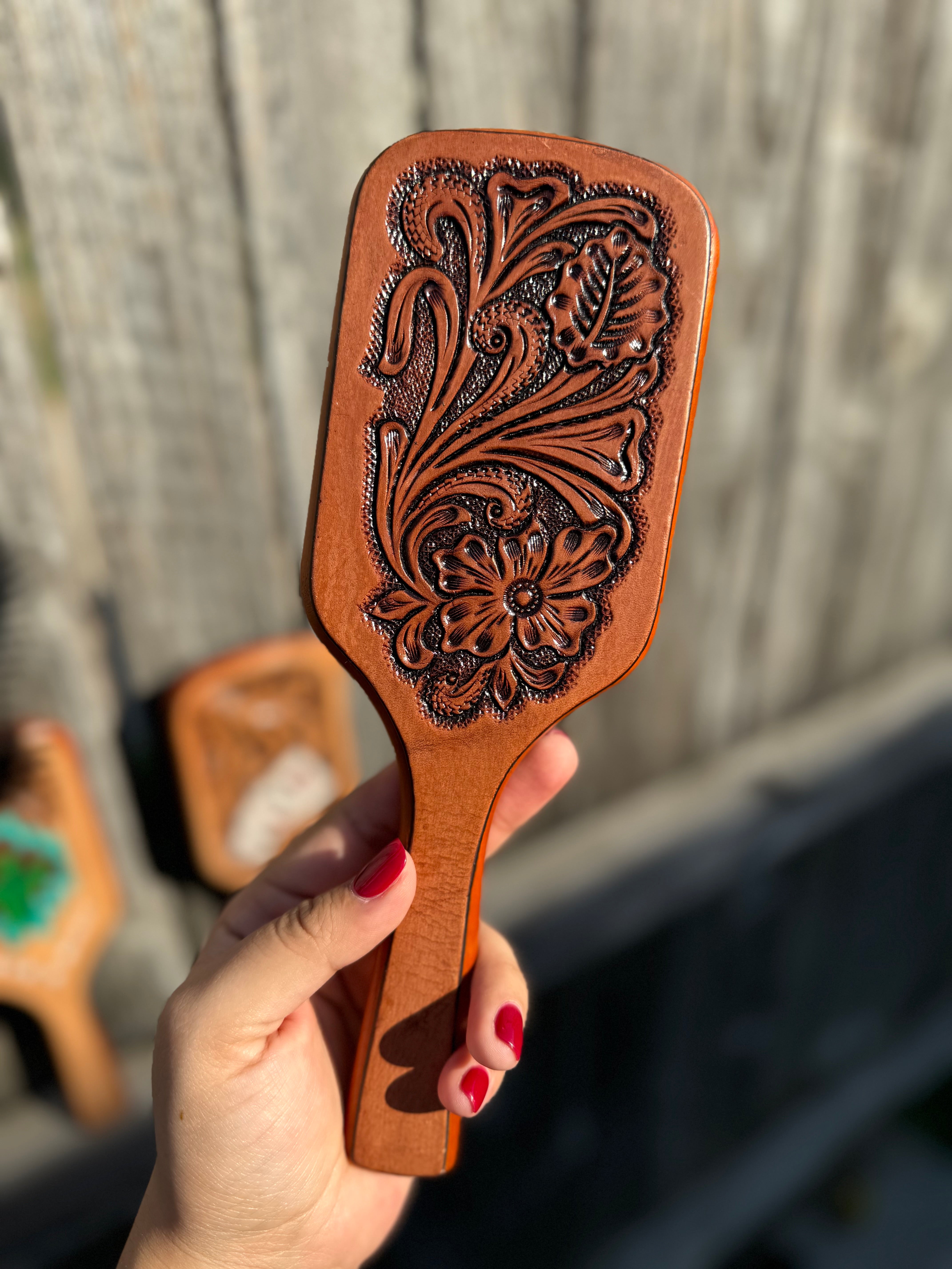 Tooled leather Paddle Hair Brush made of Genuine hand tooled leather and wood. Limited edition!