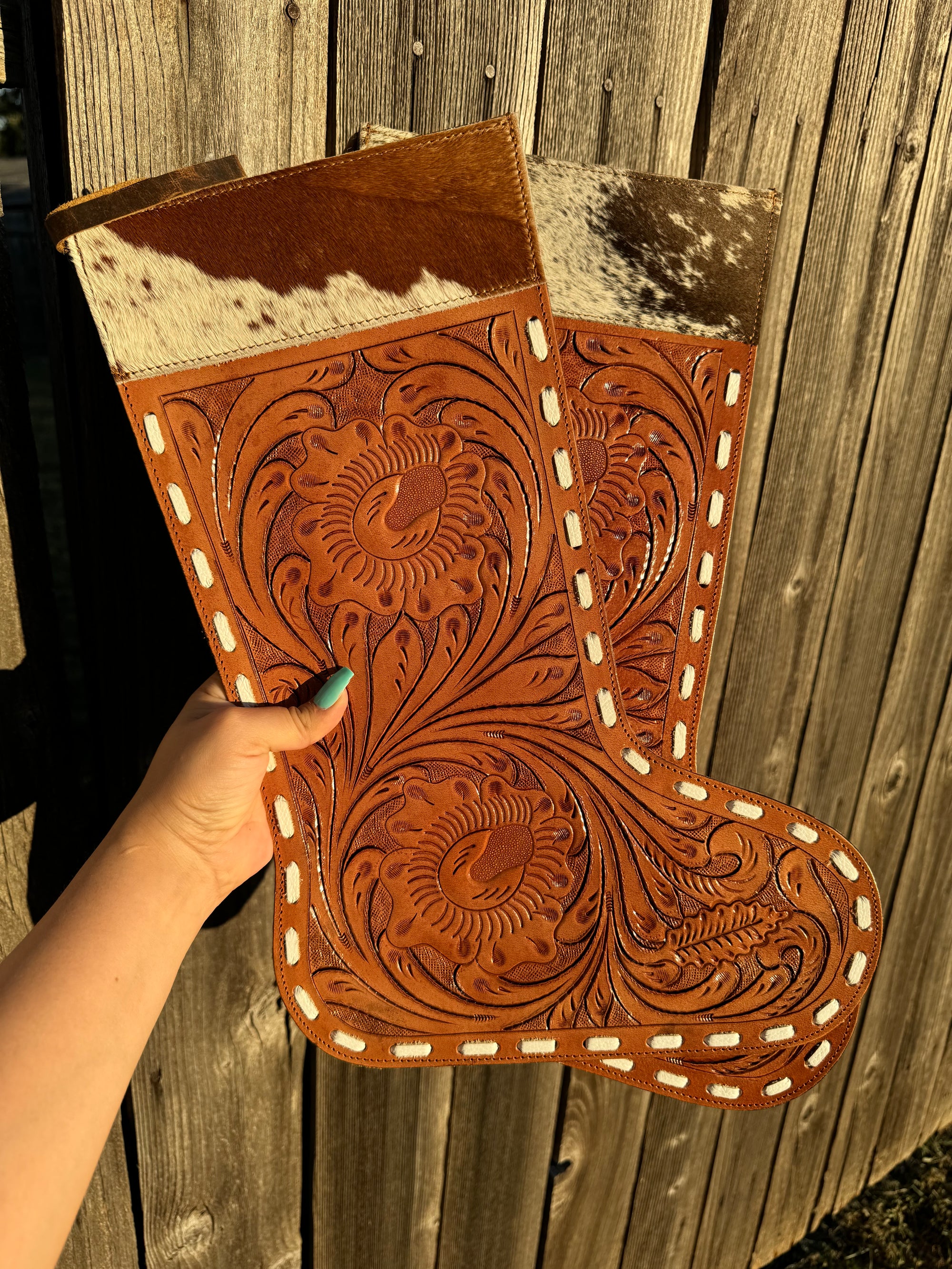 This exquisite tooled leather and cowhide stocking combines traditional craftsmanship with contemporary design, offering a unique decorative piece for any...