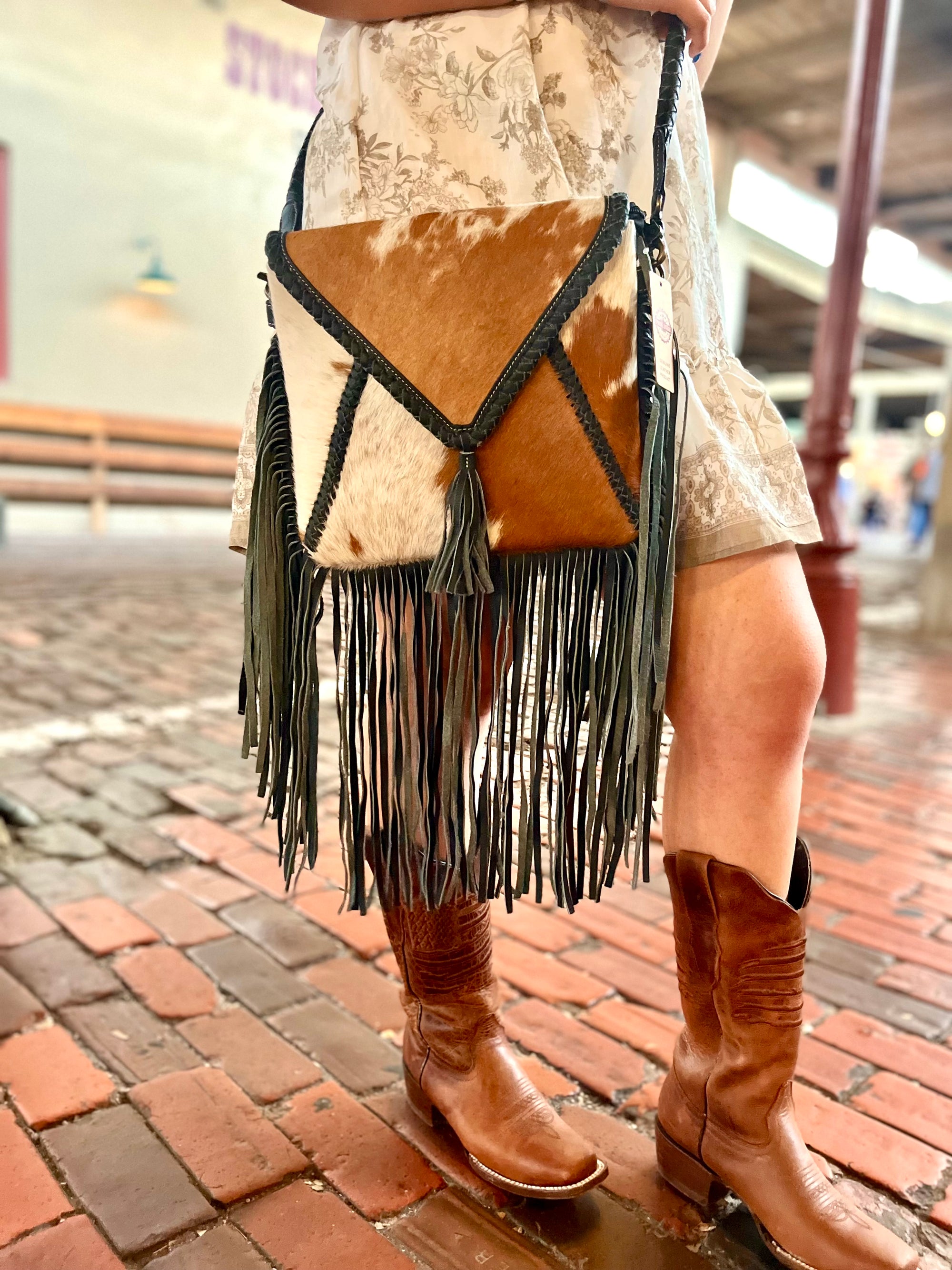This stylish cowhide crossbody bag features long fringes that add a touch of bohemian flair to any outfit. Crafted from...